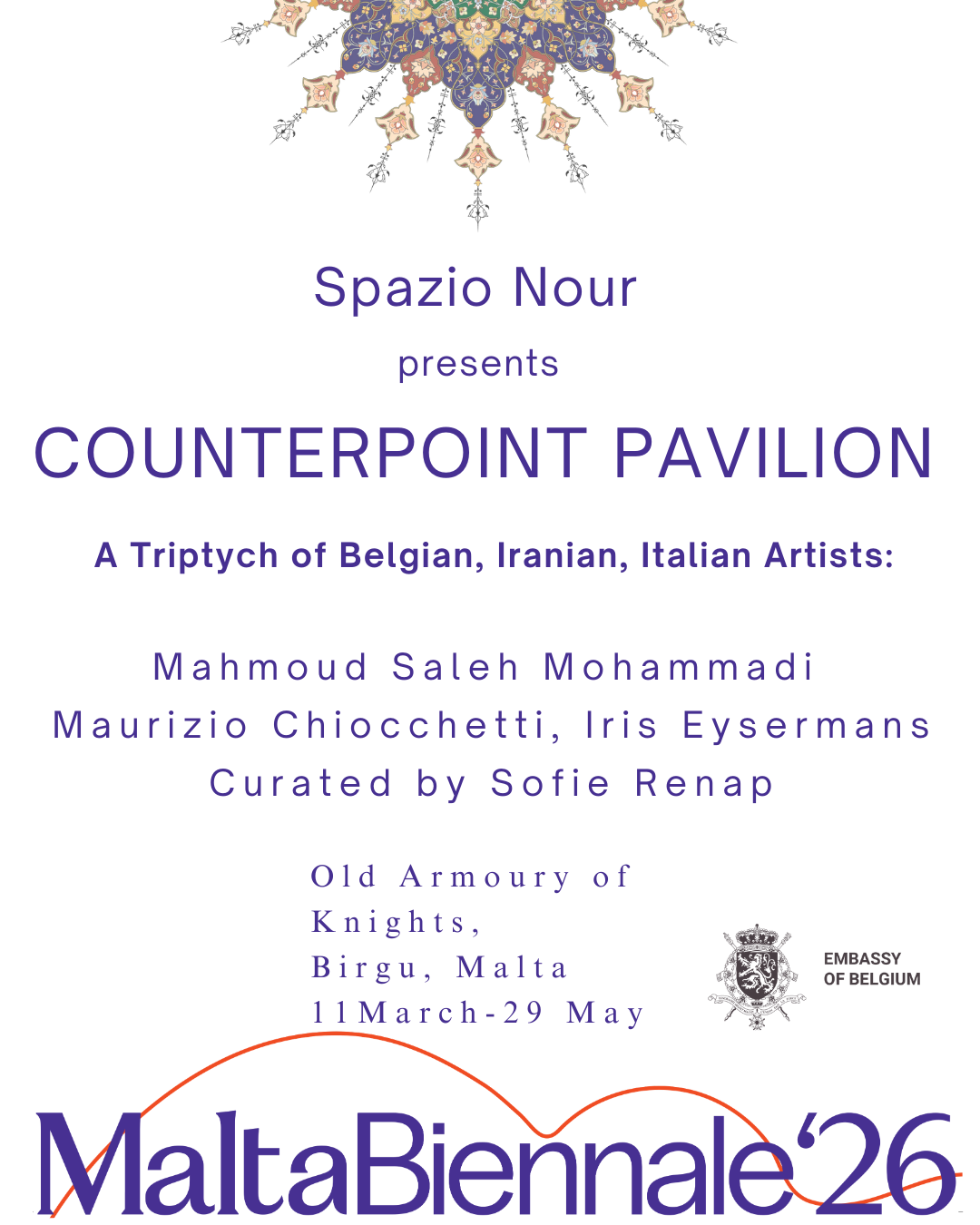 I am really happy and honored to co-create the "Counterpoint Pavilion" on the Malta Biennale, together with artists Mahmoud Saleh Mohammadi and Maurizio Chiocchetti, curated by Sofie Renap and cultural organization Spazio Nour. Welcome to our Pavilion in Birgu, Malta between 12 march and 29 may 2026!
